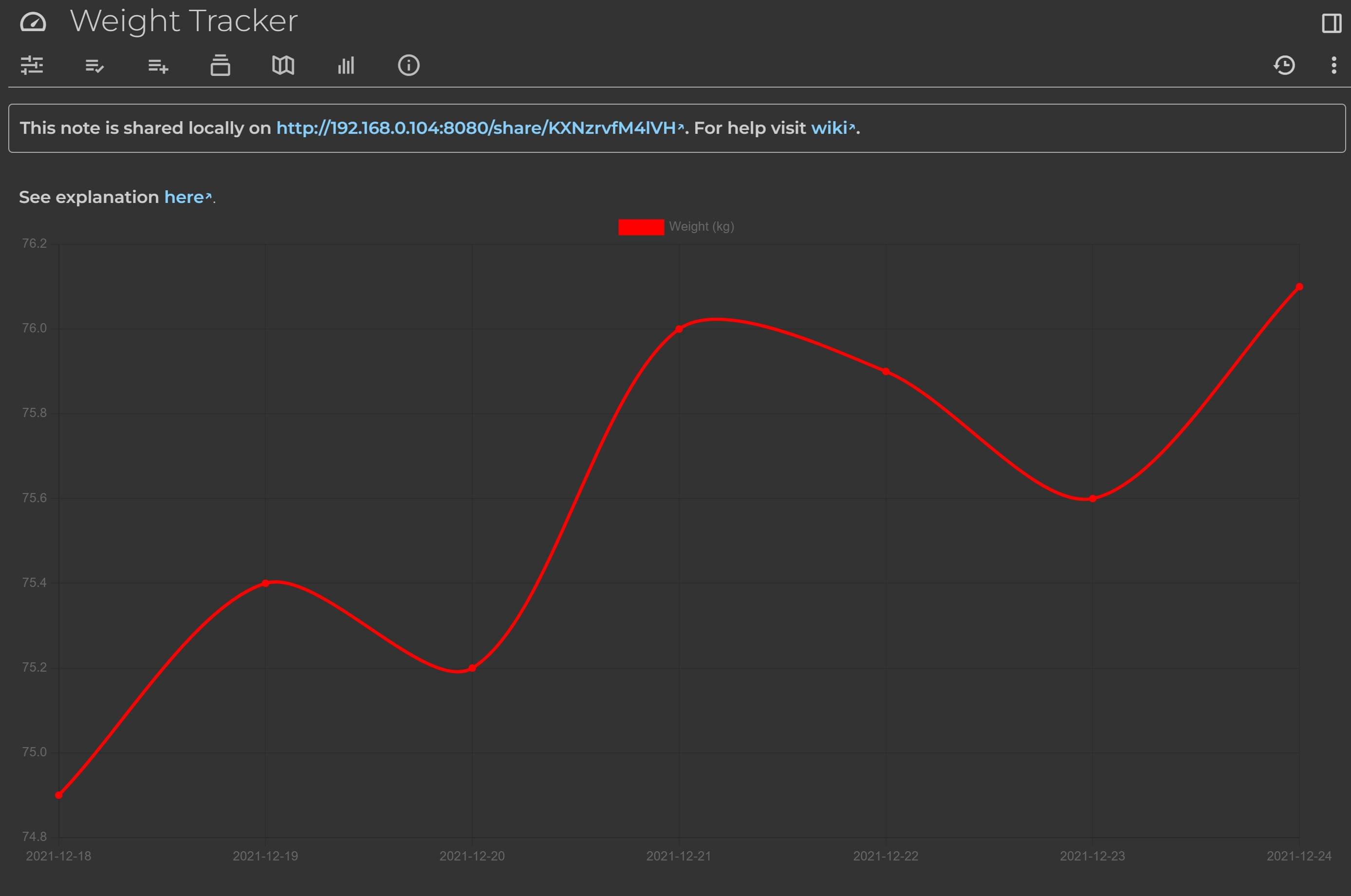 Trilium 提供的一种特殊类型的笔记,它允许你将笔记的内容渲染成动态的 HTML 页面,配合上面的 Promoted 属性,可以完成一个体重 Tracker,如下所示