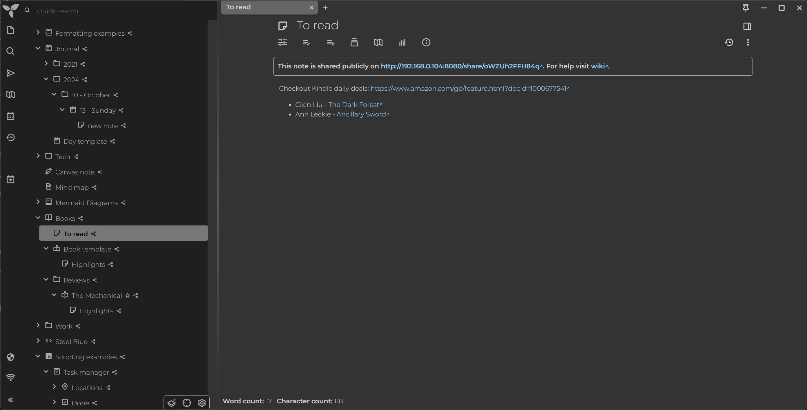 将笔记类型设置成 Book 后,Trilium 就会按顺序显示其子笔记的内容,从而营造出一种线性的、类似书本的阅读体验。这种格式对于以连贯、连续的方式查看多个较小的笔记特别有用。